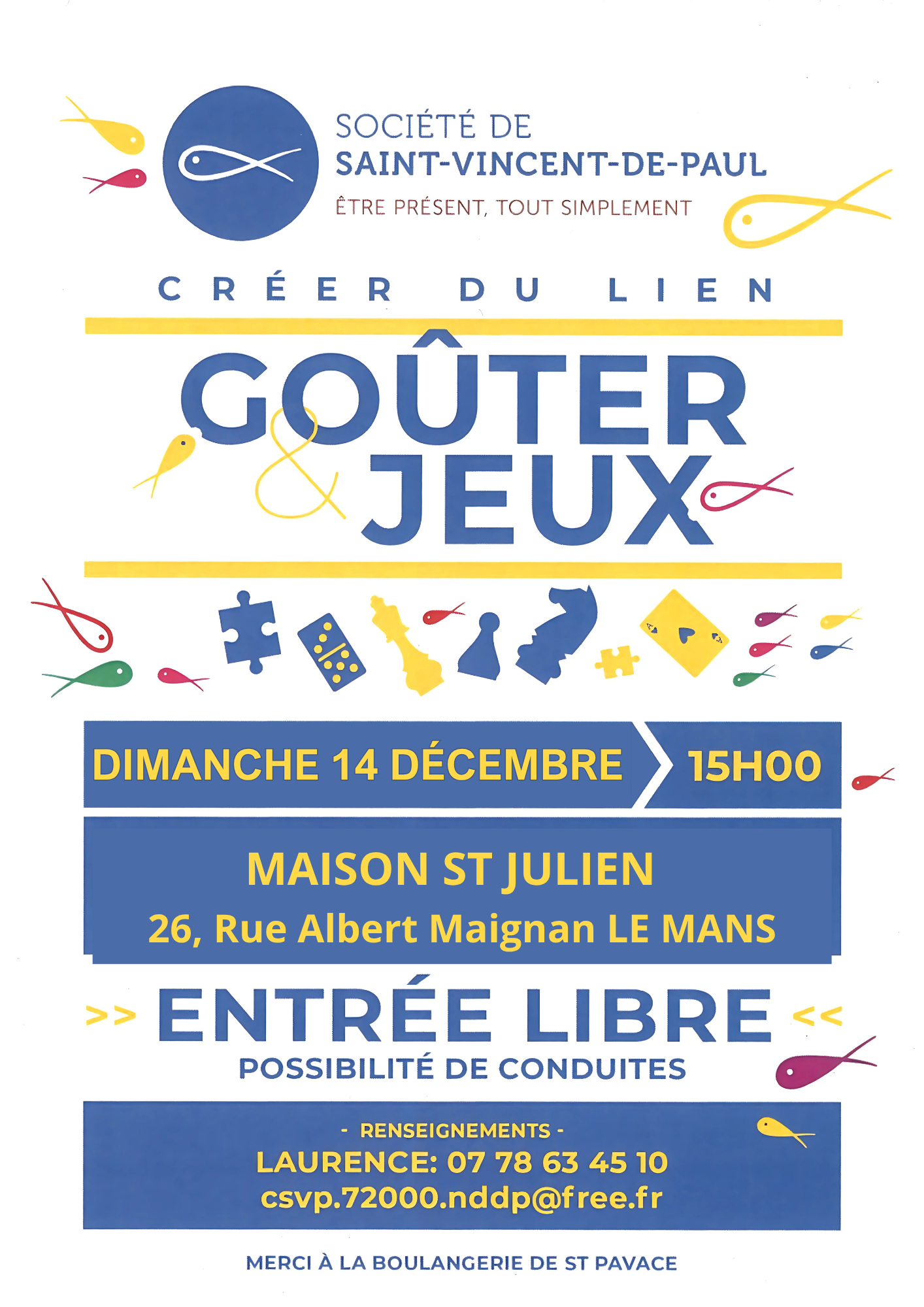 La Société St Vincent de Paul organise le dimanche 14 décembre une après-midi « goûter jeux », pour les personnes qui souhaitent créer du lien et faire des rencontres autour du jeu. C’est un projet qui se veut intergénérationnel, sans enjeu de compétition, juste celui de la convivialité ! Attention, nous changeons de lieu et nous nous retrouverons à la Maison St Julien, 26 Rue Albert Maignan au Mans. Rendez-vous le 14 décembre !