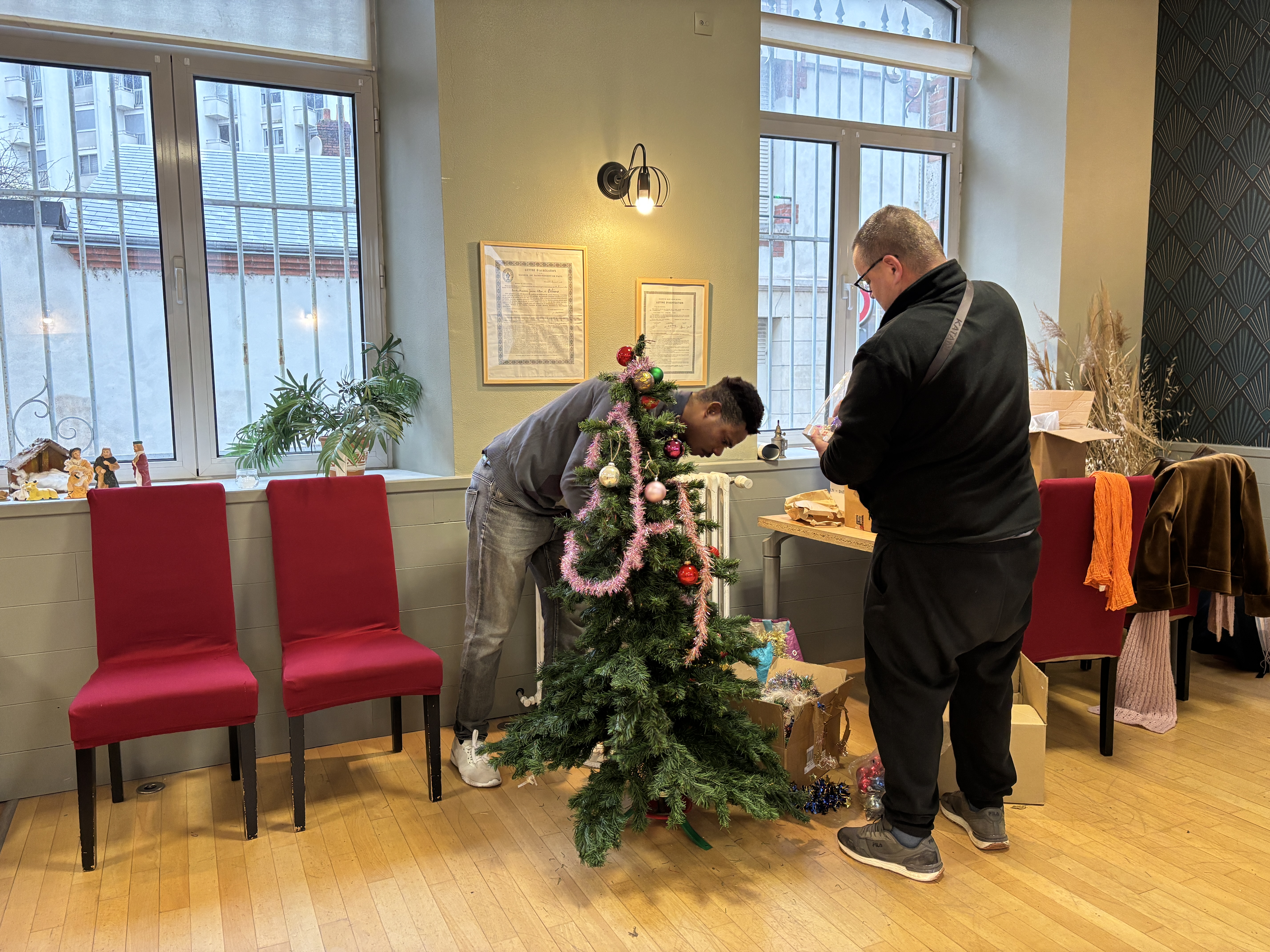 Ce dimanche, la grande salle est pleine pour participer à la décoration. Salomon et Hugues s’attaquent au sapin en plastique. Déplié en quelques secondes, il est rapidement orné de boules de couleur et de guirlandes brillantes. Le duo s’empare ensuite d’un escabeau pour fixer les guirlandes aux murs tandis que la bénévole chargée de la crèche cherche Jésus. « Je l’ai déjà caché ! » répond Hélène.