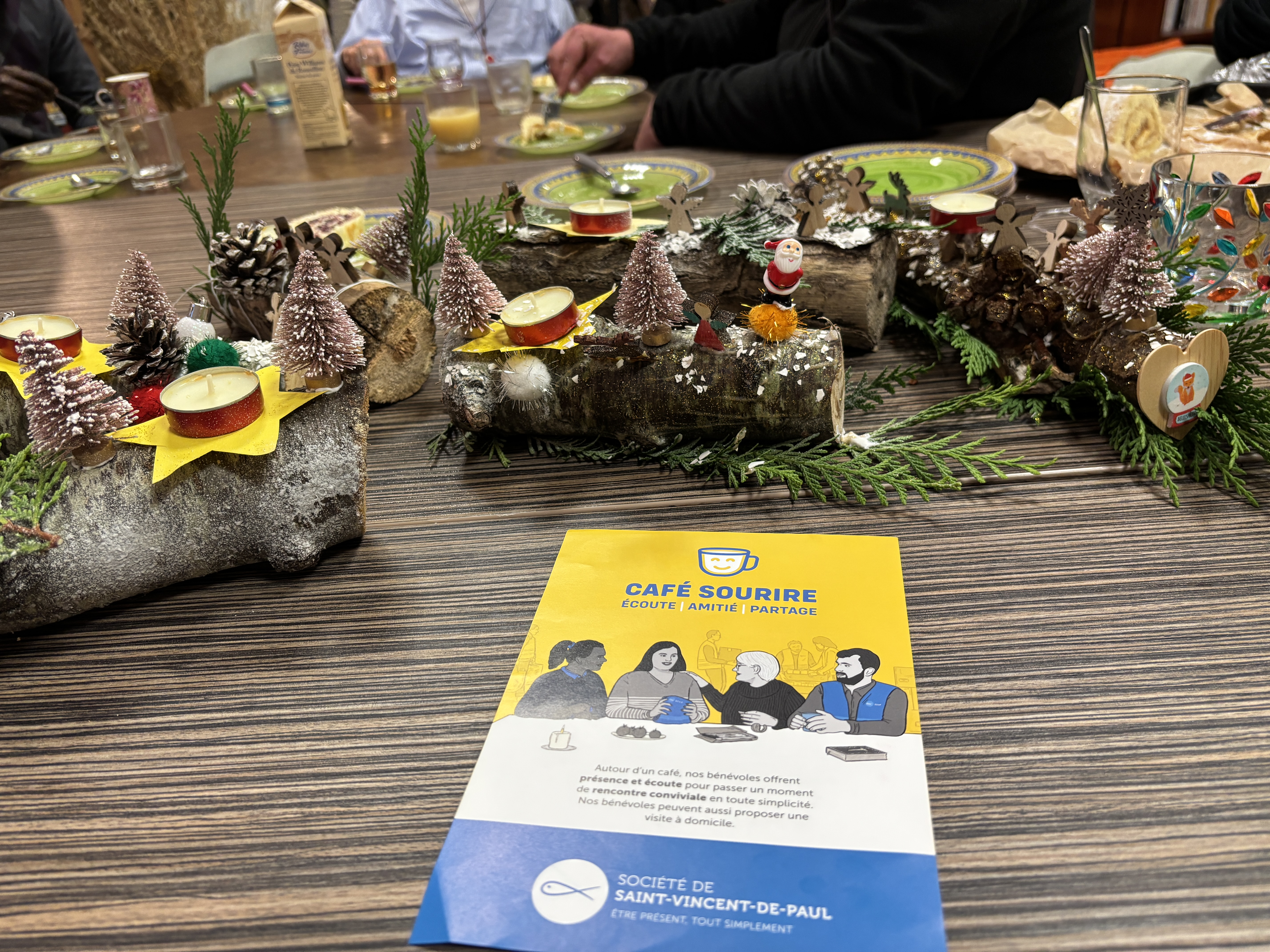 « All I want for Christmas… » Mariah Carey chante Noël depuis l’enceinte portable d’Hélène. Ce dimanche 7 décembre 2025, au Café Sourire de la Société de Saint-Vincent-de-Paul d’Orléans (45), c’est ambiance sapin, guirlandes et crèche. « Nous allons décorer le Café Sourire pour Noël, indique Hélène aux arrivants. J’ai prévu des petits jeux sur le même thème. Il y aura aussi un atelier bricolage avec sœur Marie-Suzanne. » La religieuse franchit justement la porte chargée d’un lourd sac de courses rempli de petites bûches, branches de sapin, tubes de colles et autres accessoires de décoration. « J’ai récupéré des buchettes dans le jardin de la communauté, sourit la religieuse. Je vous propose de réaliser un centre de table. »