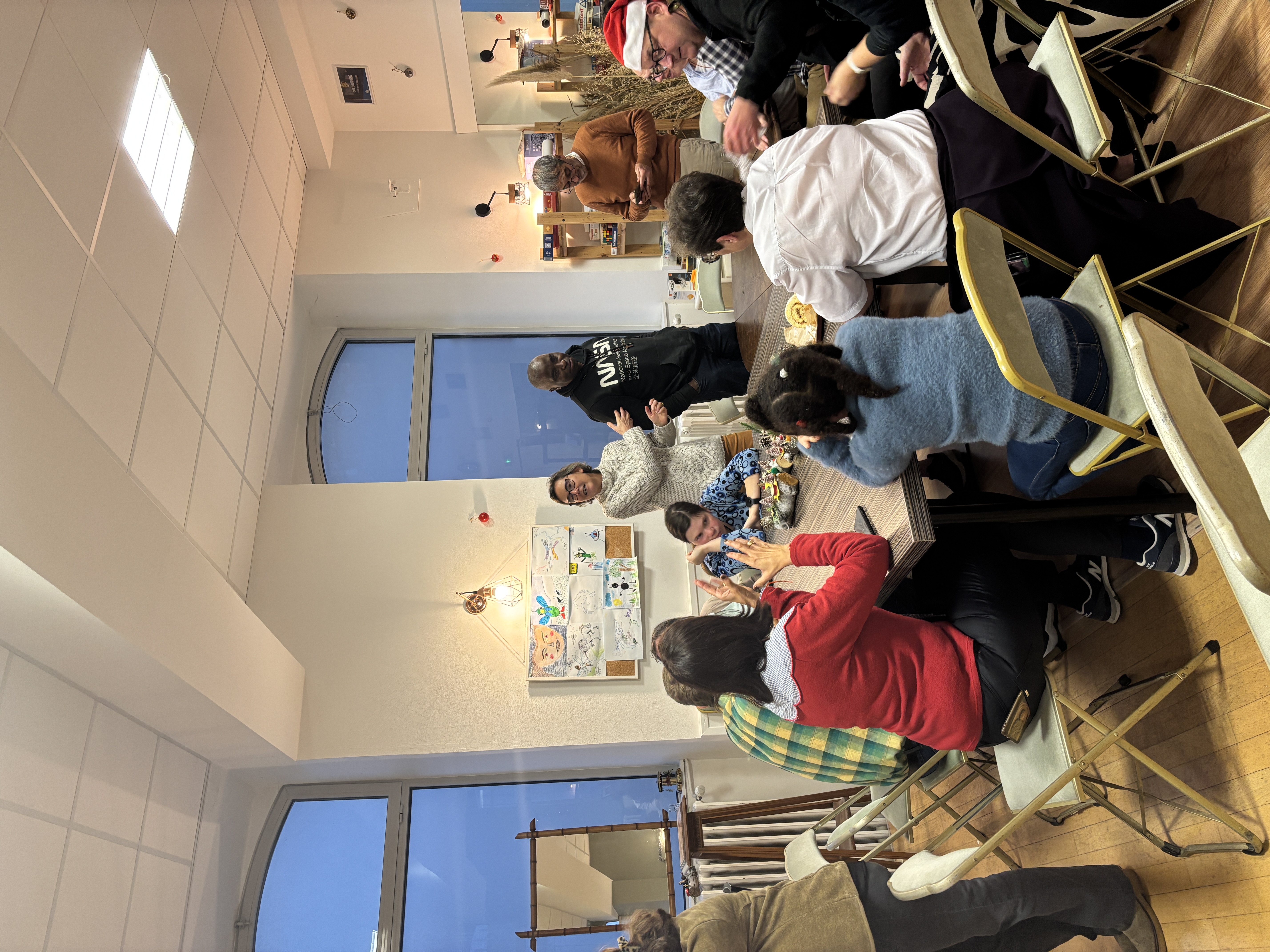 Qu’ils soient jeunes ou plus senior, seul ou avec leurs amis, bénévoles ou accompagnés, ils sont heureux de se rassembler pour ce temps convivial. Joseph, résident d’un EHPAD, participe avec enthousiasme à l’atelier jeux de société. « Suis-je dans la crèche ? » demande-t-il aux autres joueurs. Il doit deviner le mot collé sur son front. « Non, pas tout à fait ! » Pour lui c’est « renne » pour son voisin « santon », Hélène participe avec joie, un post-it « Jésus » collé au dessus de ses lunettes. Entre deux parties, Joseph passe ses mains sur le pelage de Ramsès, le chien d’Éric. « Je sais que Joseph aime les animaux, raconte le bénévole qui se charge d’emmener et ramener Joseph à son EHPAD. Alors je lui amène Ramsès pour qu’il puisse le voir et jouer avec lui. »