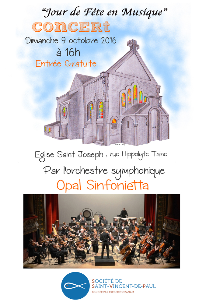Le concert annuel Ă Saint Joseph aura lieu le Dimanche 9 Octobre Ă 16 h sur un programme variĂ© par l’orÂchestre symphoÂnique OPAL SINFOÂNIETTA de Boulogne sur mer 🙂